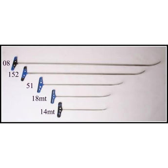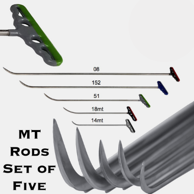 The MT Set of 5 Sharp Tools includes the following tools: 14mt, 18mt, 51, 152, and 08. These five rods are made for techs looking for a sharp-tipped tool. All of these tools have the same sharp tip and all of them are very stiff for their length. A great set of tools for any material but essential for working with aluminum. #1 Selling Hail Set!